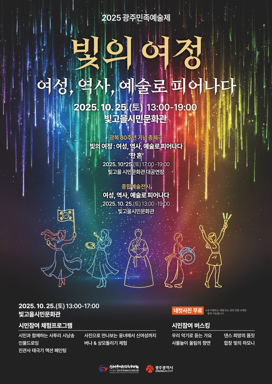 2025.10.25. (토) 13:00~19:00빛고을시민문화관[광복 80주년 기념 총체극] 빛의 여정 : 여성, 역사, 예술로 피어나다'한 혼'25일 17~19시 빛고을시민문화관 대공연장[종합예술전시]…